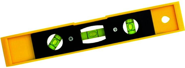A wooden or metallic block containing a small glass tube with alcohol or similar liquid and an air bubble. As the block is rotated past its intended resting position, the bubble moves, indicating something out of level.