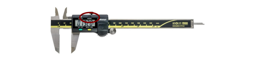 The origin button often gets confused with the zero/abs button. What the origin button does is sets the absolute zero that the tool will reference by default. For example, we will set the origin at 1 inch. If you measure anything below that 1 inch origin it will read as a negative number where anything measuring above that 1 inch origin will start at 0.000 and go up from there. If you turn off the caliper and turn it back on it will reference from that 1 inch origin.