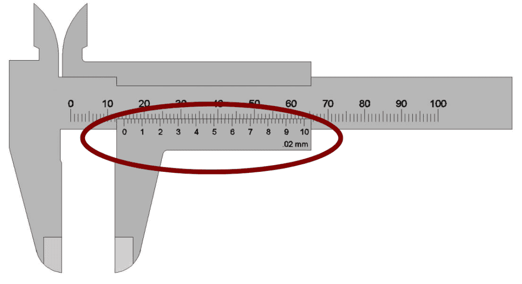 The dial contains a pointer that rotates around the housing and points to the measurement value, much like the hands on a clock. Around the edge are the graduation markings of the final inch (or millimeter). These markings are typically graduated in increments of hundredths or thousandths of whatever until the dial caliper measures in.